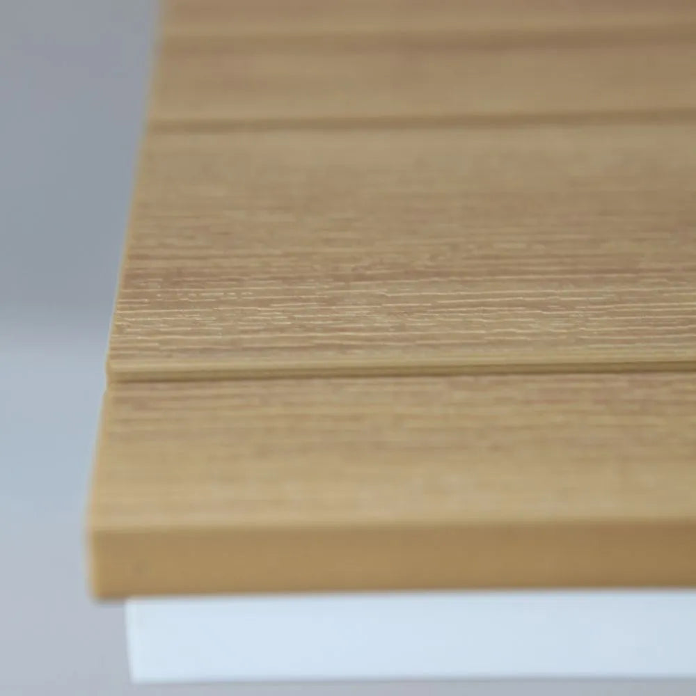Tabletop: Features a square top with a natural wood-look finish, composed of horizontal slats. This material is typically weather-resistant Polywood or PVC to mimic wood's appearance while offering superior durability and low maintenance outdoors.